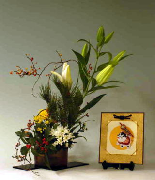小一時間かかって挿花を終え大満足の様子(仕方ない、年を取ったのでここまででお終いにしておこう と 言っていたが)